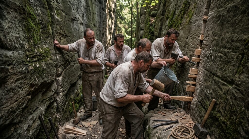 Představte si tu vizuálně i fyzicky drásavou scénu: Je parné léto. V úzké, stinné rokli pod Hrubou Skálou se tísní skupina pěti mužů v hrubých, propocených lněných košilích. V lomu se nehne ani lístek, vzduch se tetelí horkem. Nemají k dispozici absolutně žádnou techniku, žádné dynamitové nálože (které by pískovec beztak jen znehodnotily na drť), žádné respirátory. Mají jen železná dláta, obrovské dřevěné palice, suché bukové klíny a vodu. Muži vysekají do skály hluboké drážky, natlučou do nich vysušené dřevo a začnou ho polévat vodou. Dřevo začne pomalu bobtnat. Ta tichá, nezadržitelná expanzivní síla po několika hodinách s děsivým, ohlušujícím praskotem – který zněl jako výstřel z děla – odtrhne mnohatunový blok.